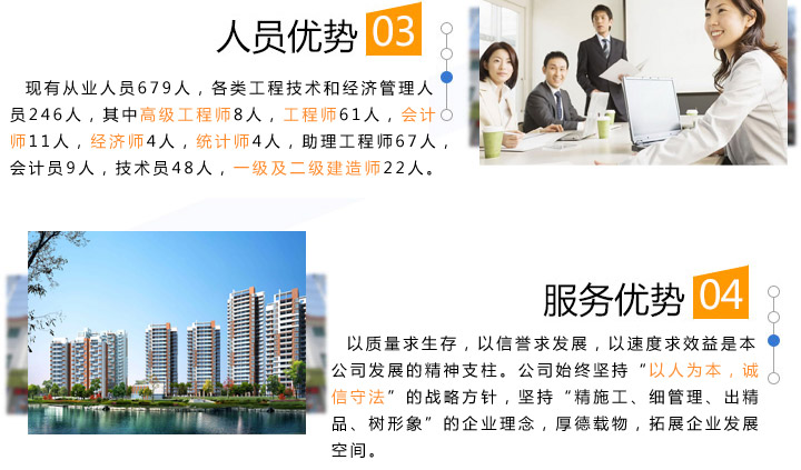 質(zhì)量求生存,以信譽求發(fā)展,以速度求效益是本公司發(fā)展的精神支柱。公司始終堅持“以人為本,誠信守法”的戰(zhàn)略方針,堅持“精施工、細管理、出精品、樹形象”的企業(yè)理念,厚德載物,拓展企業(yè)發(fā)展空間。
